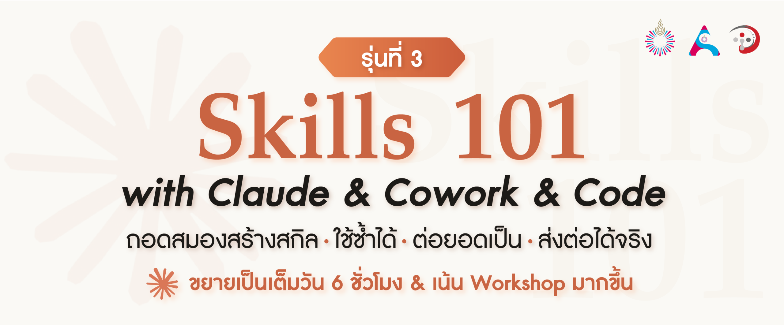 เรียนรู้ตั้งแต่แนวคิดพื้นฐานของ Skills ไปจนถึงการสร้าง Skill ด้วยตัวเอง การปรับปรุงให้ใช้งานซ้ำได้ และการนำไปใช้จริงบน **Claude, Claude Cowork และ Claude Code** เพื่อสร้าง AI Workflow ที่ต่อยอดและส่งต่อให้ทีมได้จริง