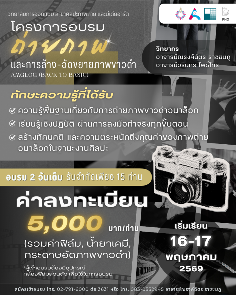 ค่าลงทะเบียนเรียน: 5,000 บาท/ท่าน (รวมค่าฟิล์ม, น้ำยาเคมี, กระดาษอัดภาพขาวดำ)