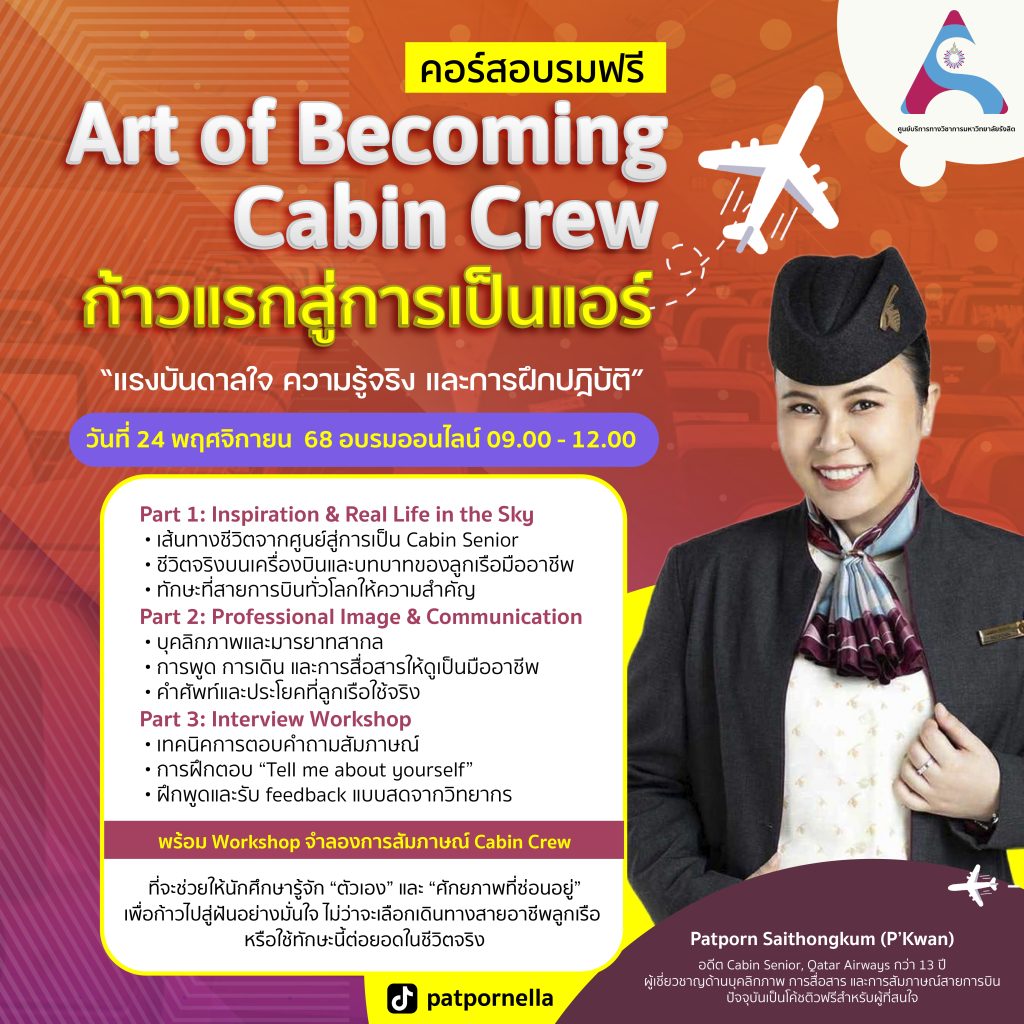 โครงการอบรมฟรี ไม่มีค่าใช้จ่ายก้าวแรกสู่เส้นทางแห่งความฝัน  ขอเชิญผู้ที่สนใจอาชีพ “แอร์โฮสเตส” เข้าร่วมอบรมฟรี!Art of Becoming Cabin Crew – ก้าวแรกสู่การเป็นแอร์พร้อม Workshop จำลองการสัมภาษณ์ Cabin Crewเปิดประสบการณ์จริงจากอดีต